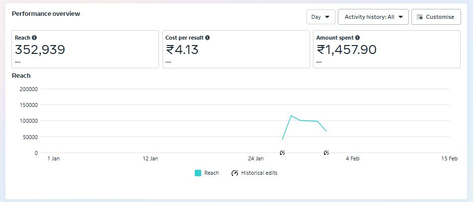 With a strategic focus on low-budget bidding and audience precision, our brand awareness campaigns consistently delivered exceptional reach and visibility. Leveraging optimized bidding strategies, we reached over 3.5 lakh+ users at just ₹2–₹4 per result—ensuring maximum exposure without overspending. By tailoring ad creatives to highlight brand USPs and messages, we successfully engaged the right audience segments while maintaining a powerful presence across Meta platforms. Our data-driven approach not only boosted visibility but also sparked meaningful conversations, as seen in the results and testimonials shared by our clients.
