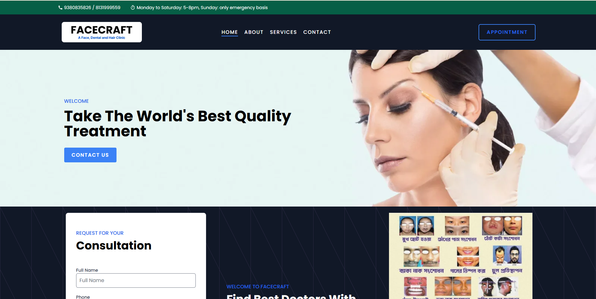 We designed the Facecraft website to reflect the premium quality of their face, dental, and hair treatments. Built with a modern, responsive layout and optimized for SEO, this lightweight site delivers fast performance across devices. Using clean visuals, brand-consistent colors, and healthcare-industry aesthetics, we created an engaging user experience.